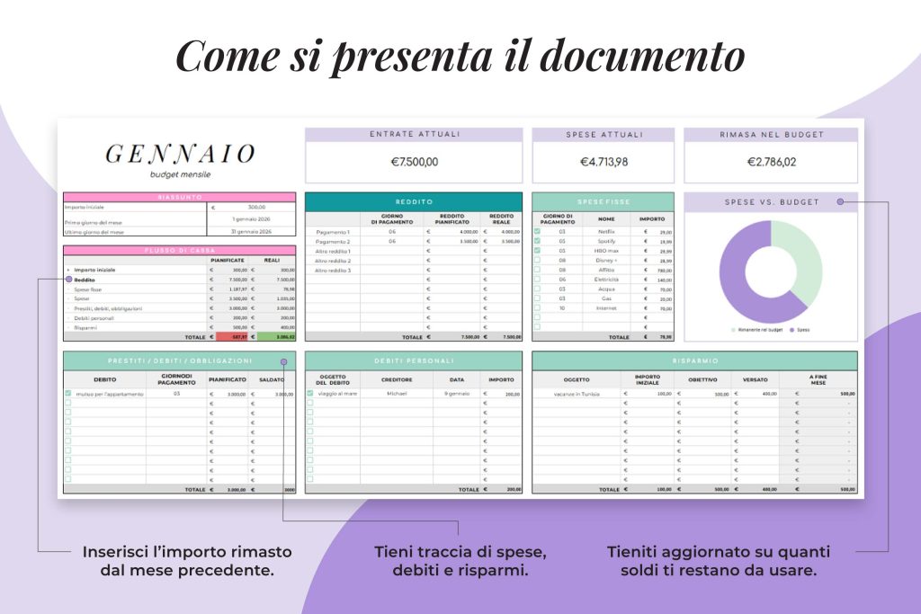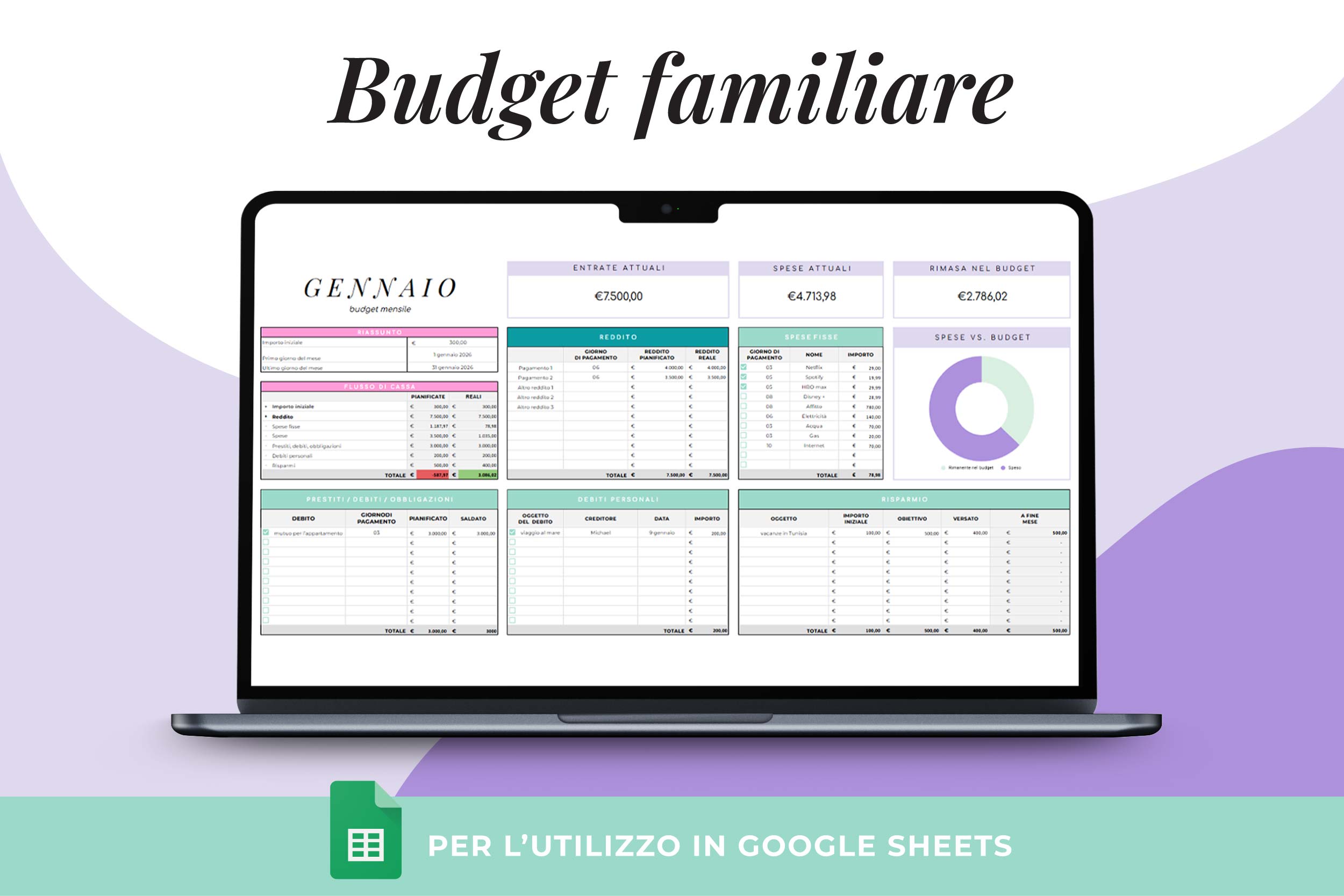 - Facilità d'uso – iun foglio intuitivo che ti permette di iniziare a gestire il budget in meno di 5 minuti.